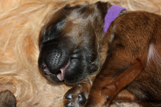 Hündin lila Band, geboren am 27.09. um 22.28 Uhr, Gewicht 480 Gramm Rüde grünes Band, geboren 27.09. um 23.47 Uhr, Gewicht 440 Gramm