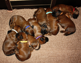 Rüde Dio Mio blaues Band Hündin Dorothee oranges Band Hündin Déja Vu rotes Band