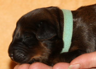 Rüde braunes Band, geboren am 26.10. um 19.52 Uhr, Gewicht 370 Gramm Rüde grünes Band, geboren 26.10. um 20.38 Uhr, Gewicht 420 Gramm